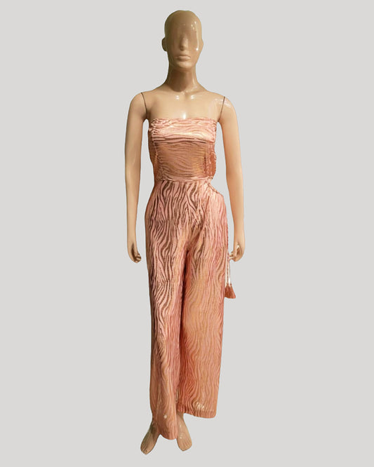 Rose Gold Foil Printed Off Shoulder Jumpsuit With Cut-Out Details And Back Smocking