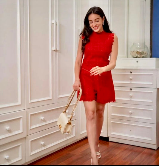 Scarlet Sleeveless Playsuit With Raw Edges Detailing And A Zip Fastening.