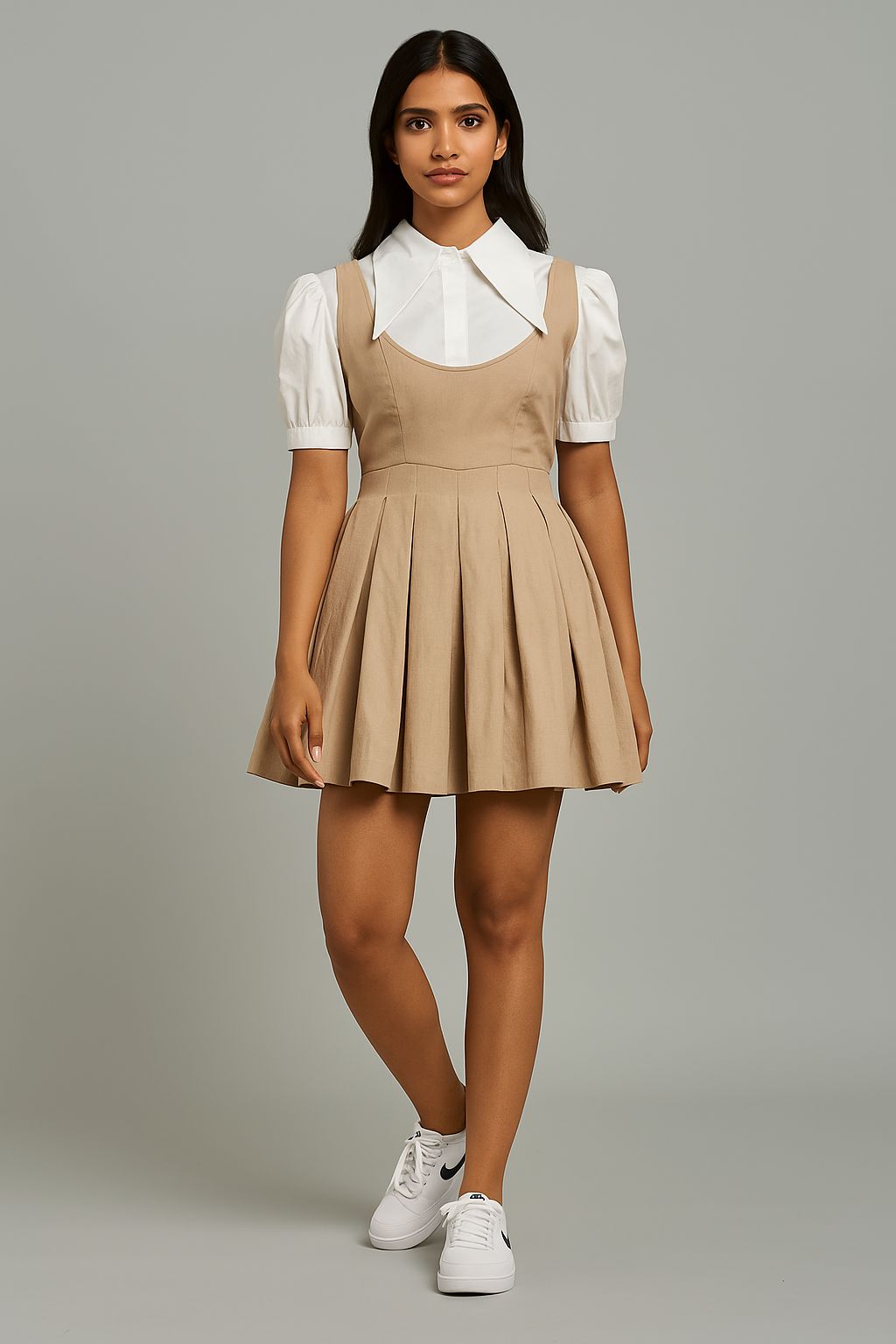 This beige and white co-ord is a style statement in itself. Featuring a crisp white shirt with an exaggerated collar and structured 3/4 sleeves, layered perfectly under a sleeveless beige pleated mini dress.The dress is tailored with soft pleats and a flattering neckline.