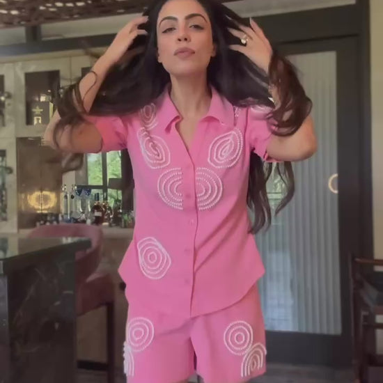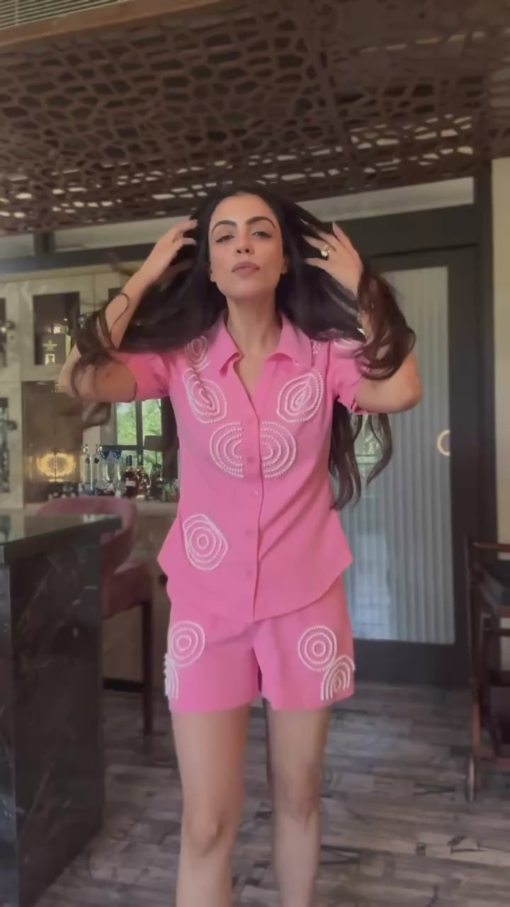 Make a statement with this stunning pink co-ord set, designed to turn heads. The beautifully crafted shirt features intricate circular bead detailing, adding a touch of elegance and sophistication. Its flattering silhouette pairs seamlessly with the chic, lightweight fabric of the matching shorts, creating a look that is both stylish and comfortable. Perfect for daytime outings or evening events, this co-ord set offers the perfect blend of glamour and ease.
