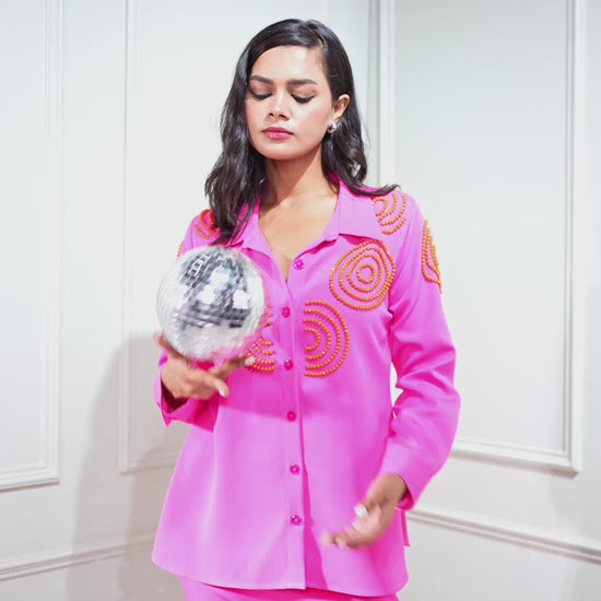 Elevate your style with this stunning blue beadwork co-ord set, featuring a beautifully crafted shirt adorned with intricate circular bead detailing. The shirt's elegant silhouette pairs perfectly with the chic bell-bottom pants, creating a harmonious look that flatters every figure. Made from lightweight Fabric.