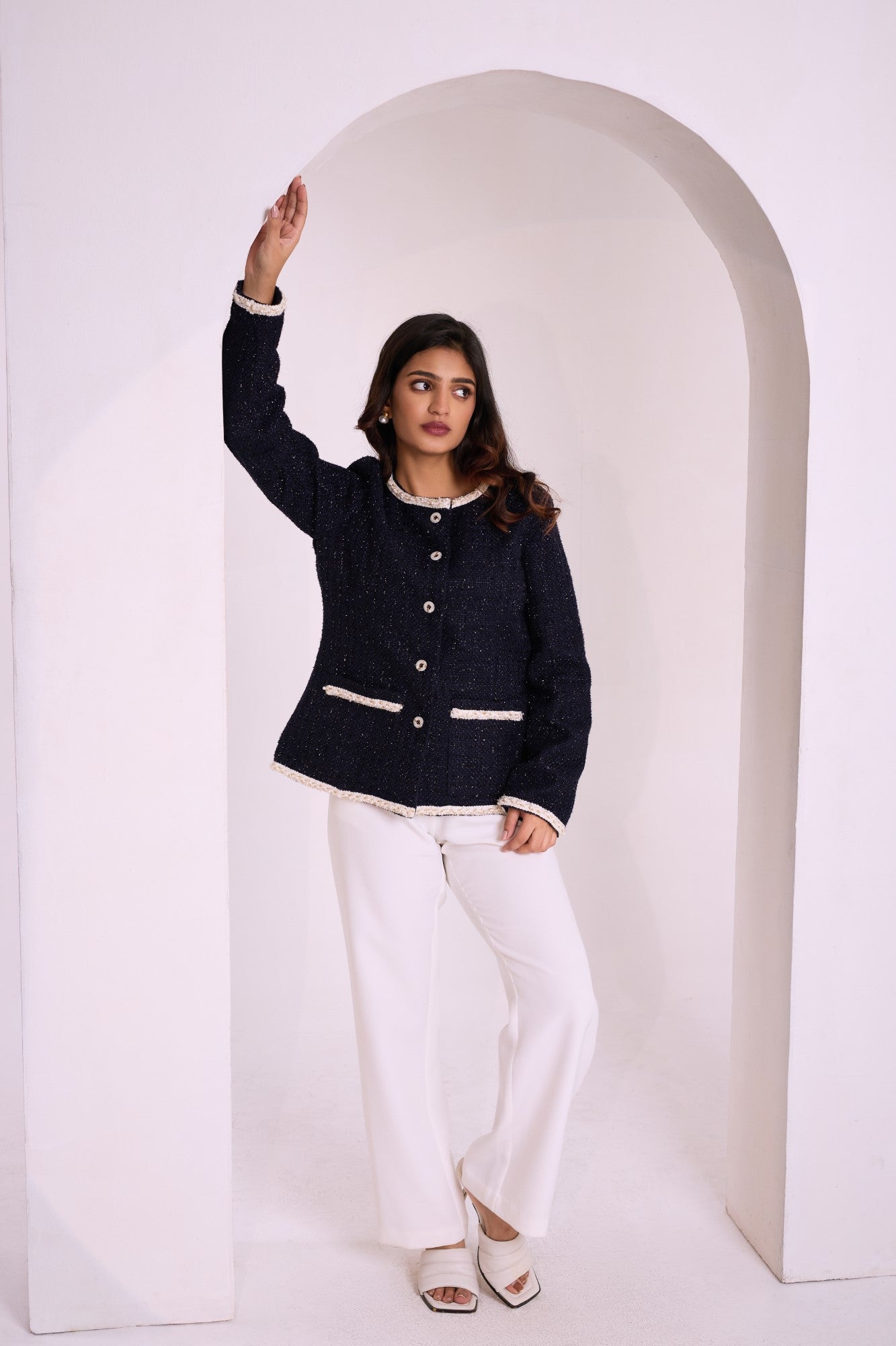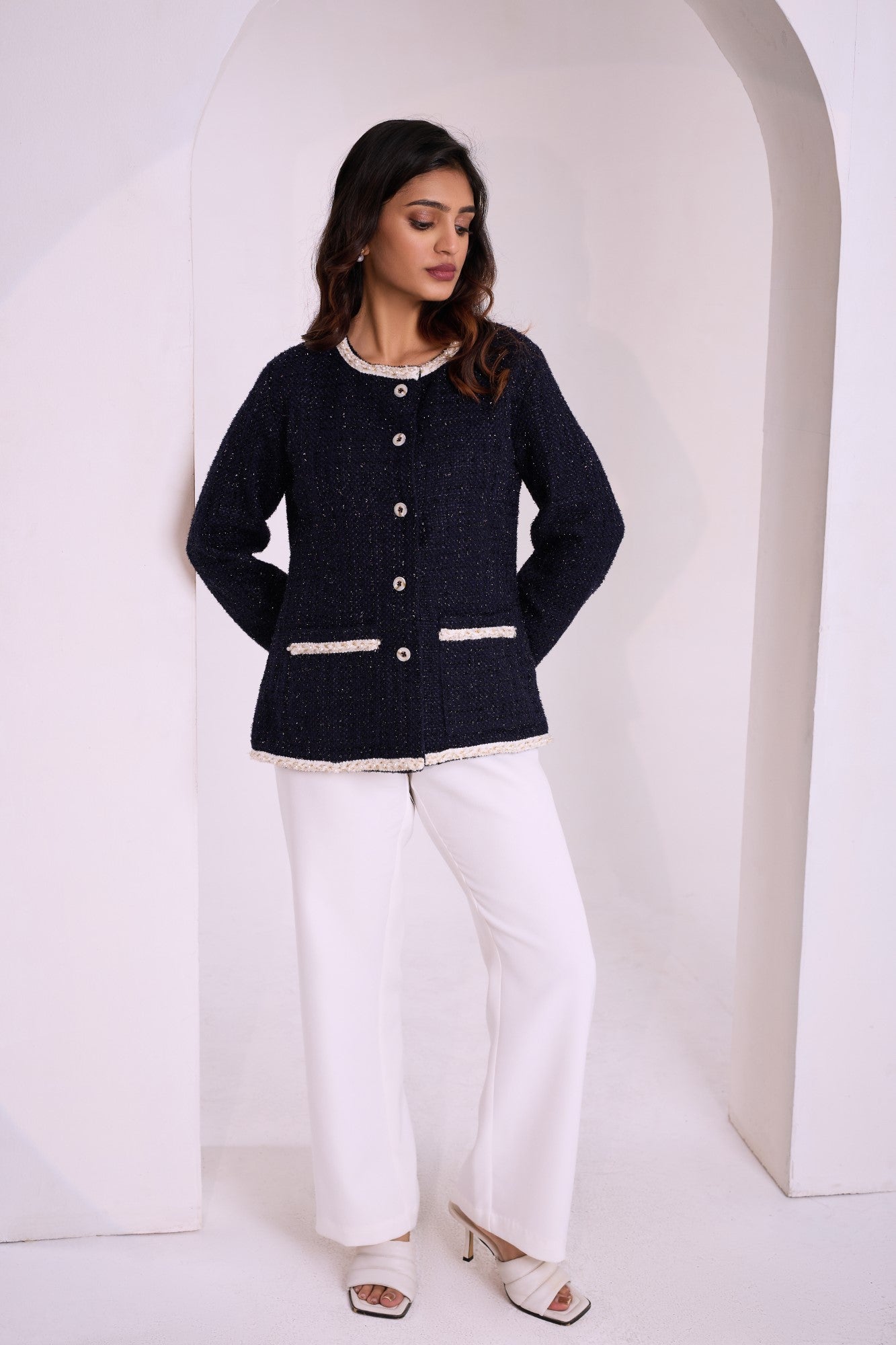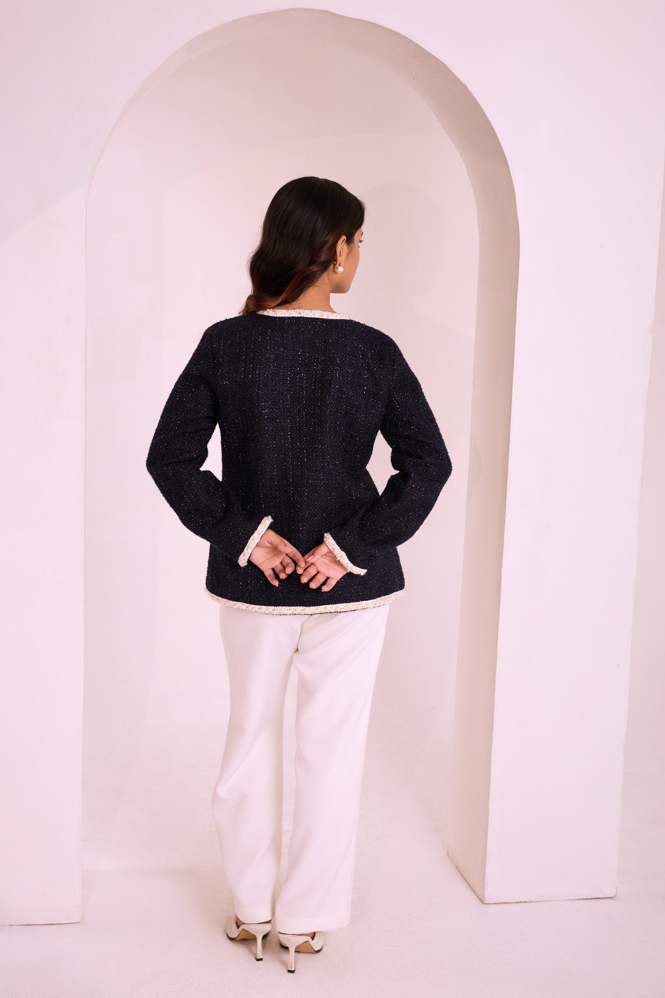 Detailed with contrast ivory trims along the neckline, hem, and pockets, it radiates understated elegance.