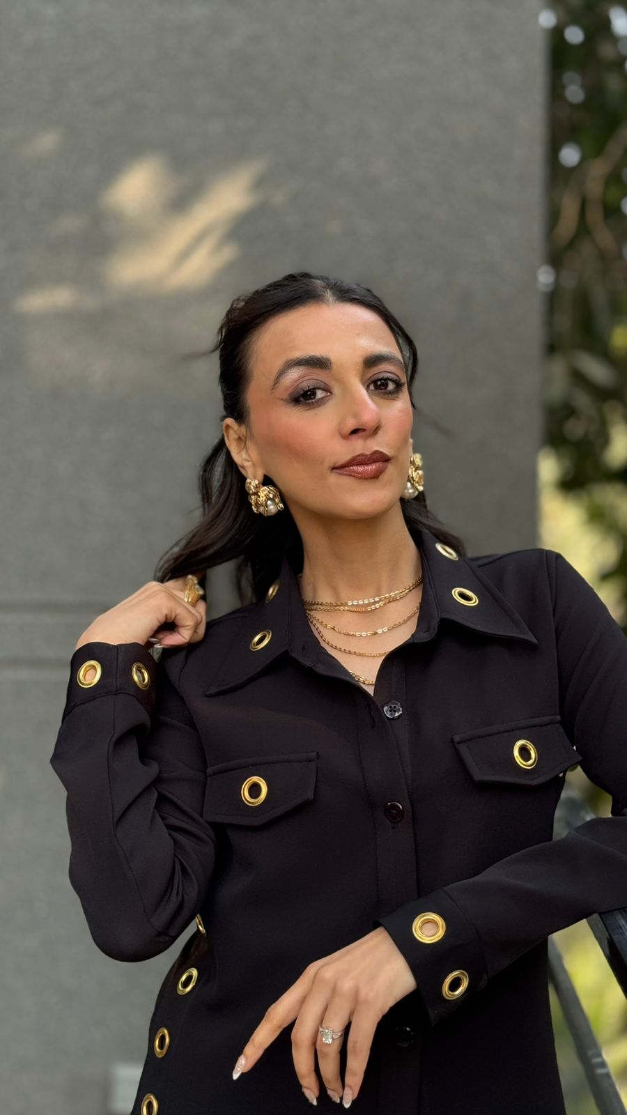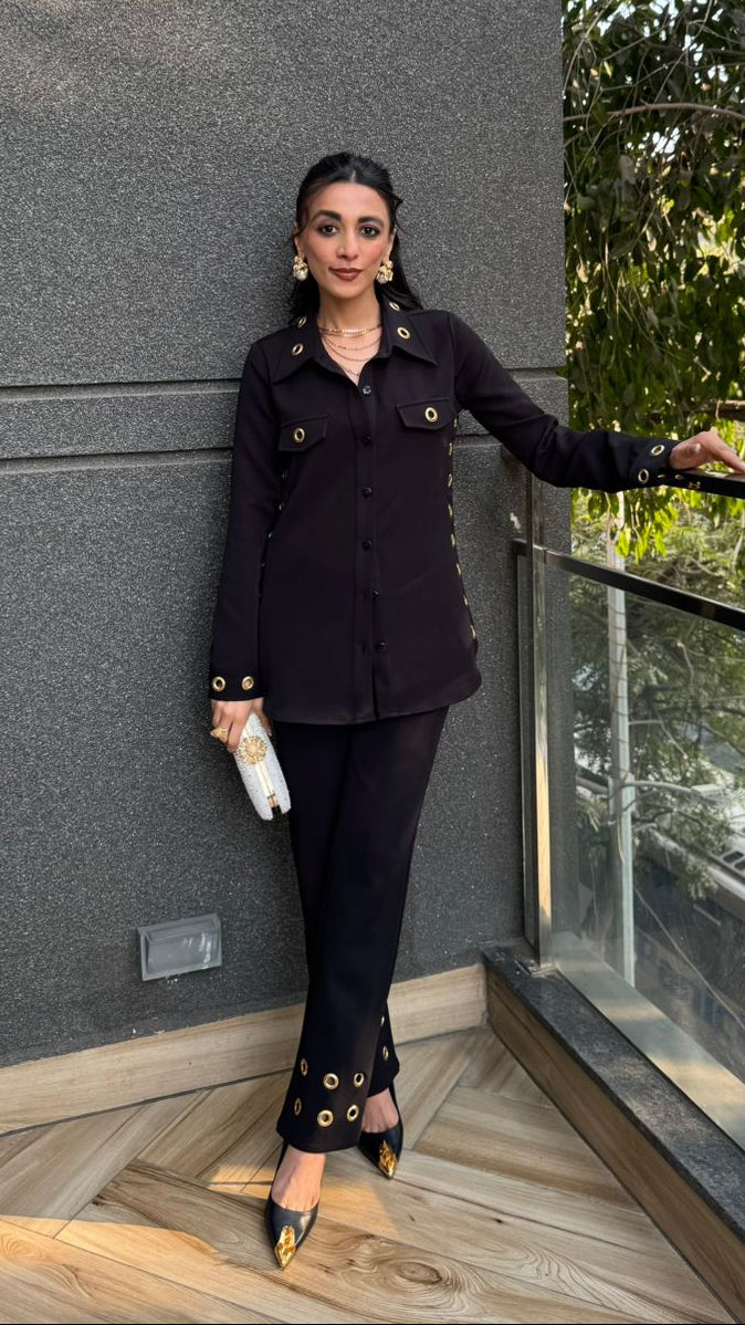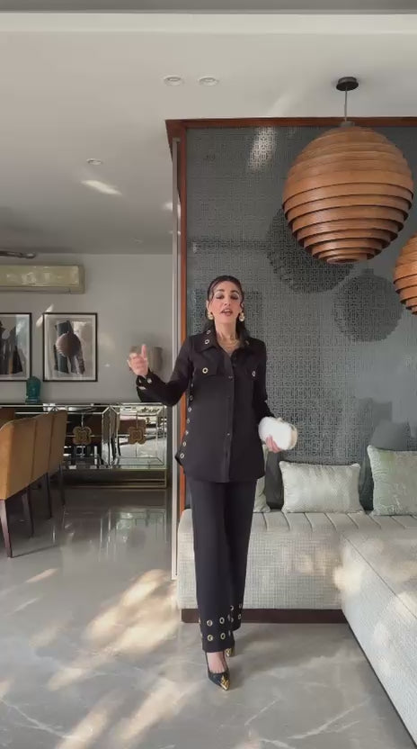 Elevate your style with the chic co-ord set with eyelet detailing. The pants are flared and has eyelet detailing . This co-ord is perfect for any outing.